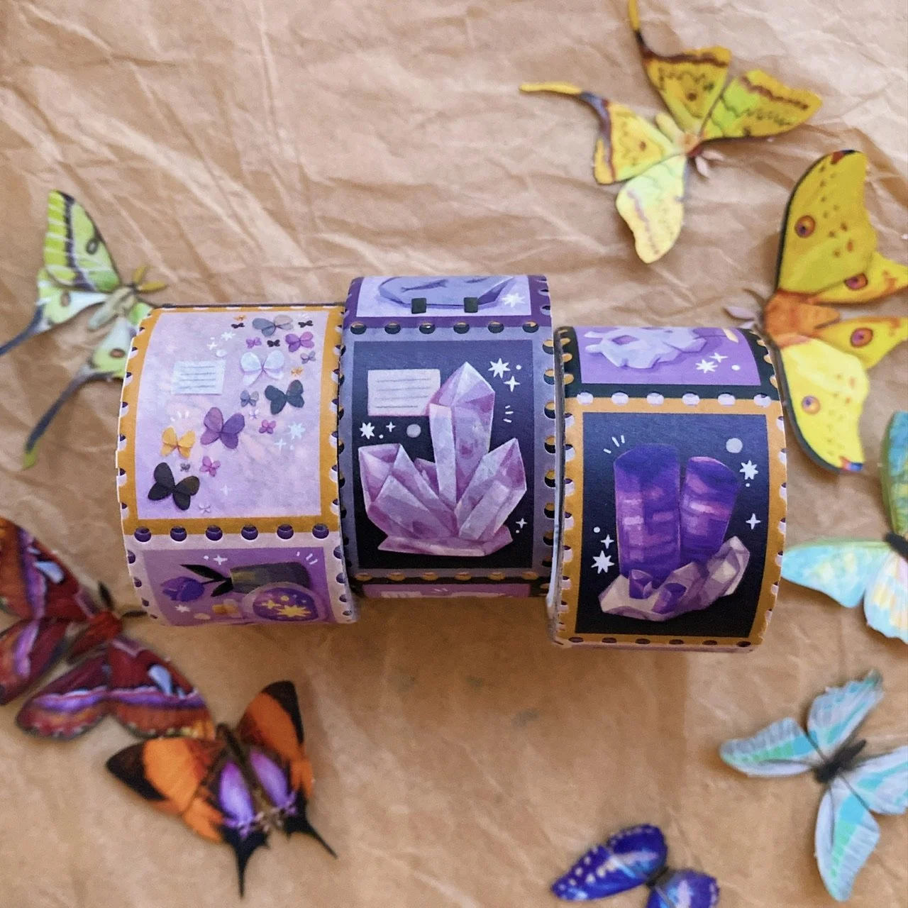 Printed paper tape with perforation for easy tear or cut guide, featuring ten unique stamp designs. Can be used individually or in a line in planners, journals, or for sealing and decorating mail. Easily peels off and leaves minimal residue on most surfaces. A perfect gift for the stationery and snail mail lover in your life - or you!